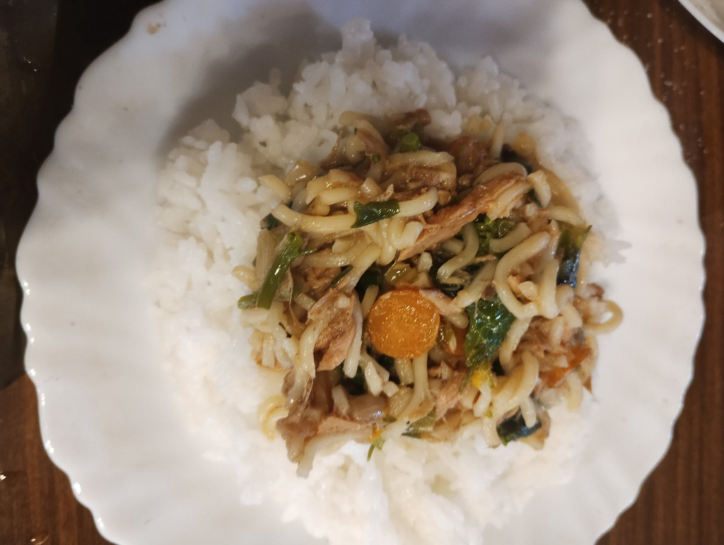 これは現地で高級食とされるインスタントラーメン、魚の缶詰をねこまんまのように熱いご飯にぶっかけて食べるだけなのですが、伝統食を食べた後にはしみいるほど美味しくて、涙が出てきます(笑)